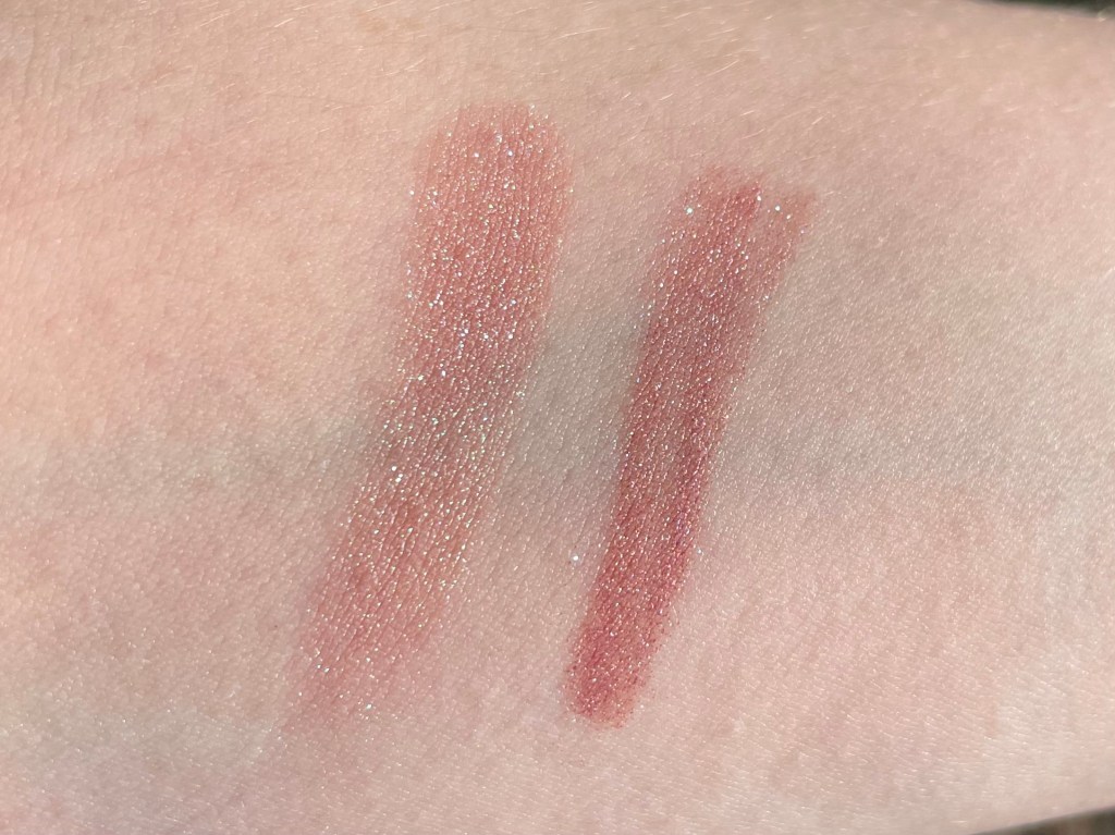 On paper, Aurora and ColourPop Rooftop Cocktails are very similar: each has a pinkish base and fine blue-green glitter. In practice…all right, they’re pretty similar in practice, too. That said, Rooftop Cocktails has a sheerer, cooler-toned base and more noticeable glitter, which makes it bluer and shinier than Aurora on the eyelid. I find myself wearing Aurora more often for work and RC for special occasions. I’ve never tried layering them, but I’d like to! Swatches below—RC on left, Aurora on right.