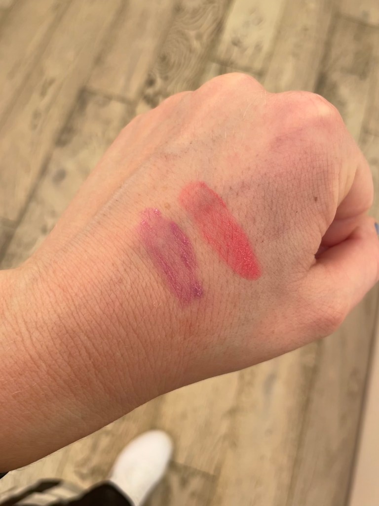 I was particularly interested in swatching the new limited-edition Cloud Paint shades, Wisp and Soar, which are exclusive to Glossier’s stores and website (i.e. not available in the Sephora down the street). Wisp is a slightly dusty lilac purple, and Soar is a bright coral pink.