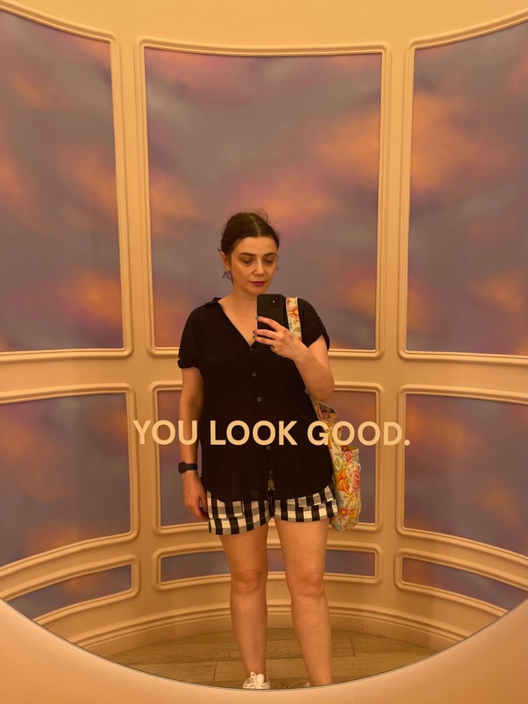 Every Glossier store has a small room, sort of a womb inside a womb, with a selfie mirror bearing Glossier’s slogan, “You Look Good.” In the Philly store, this feel-good sentiment was undercut somewhat by the fact that it was printed across a skinny mirror. You’ll just have to take my word that the skinnifying effect, especially on the face, was subtle but noticeable. Come on, Glossier! I suppose the sponge-painted shapes behind me are tributes to clouds in Rococo paintings; a swing would have been a nice addition, as in Fragonard’s famous upskirt painting.