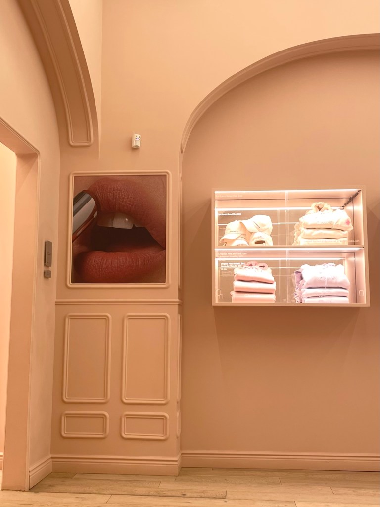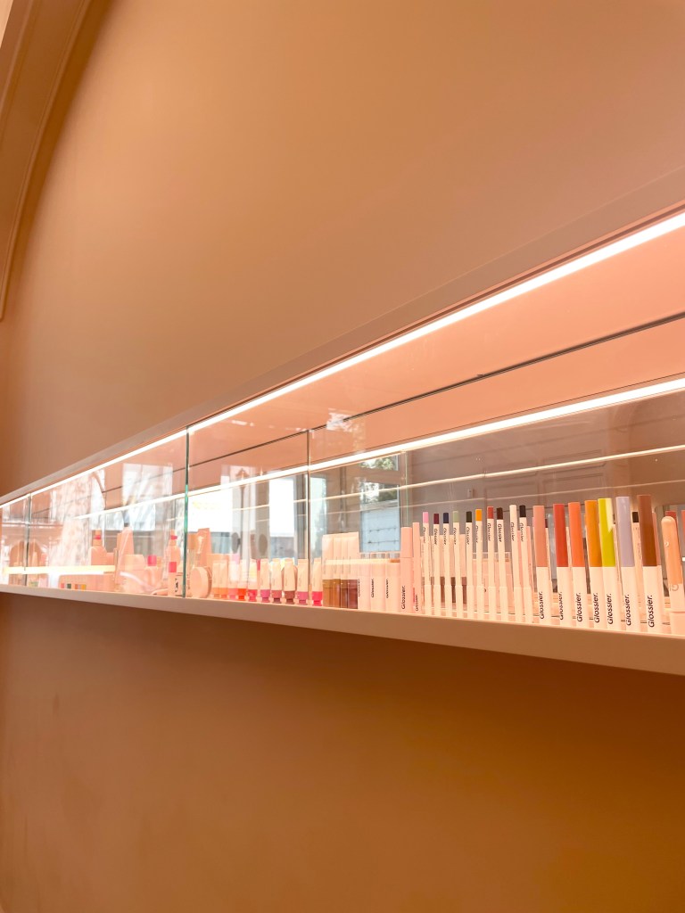 But I’m getting ahead of myself. When I stepped into the store, the first adjective that came to mind was womblike. The space was sparsely populated at 2 pm on a Tuesday (I saw maybe six other customers during my ten minutes there), and the pink walls and organic shapes felt soothing in a primal, even prenatal, way. The store consisted of two large rooms connected with a curving ramp that reminded me of a Fallopian tube. Maybe the design was actually an expression of Glossier’s support of reproductive rights, or an (unconscious?) homage to Philly’s Mütter Museum.