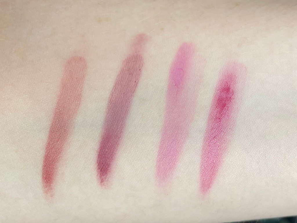 Swatches, L-R: Storm, Eve, Wisp, Haze. I’ve seen some speculation online that Wisp is merely a lighter Haze, but I don’t think that’s true: Wisp has a dusty quality absent from the redder, punchier Haze. In seasonal-coloring terms, I’d describe Haze as a “winter” color and Wisp as a “summer” one. Because of my own high-contrast winter coloring, I find Haze more flattering than Wisp (it’s probably my most-worn Cloud Paint).