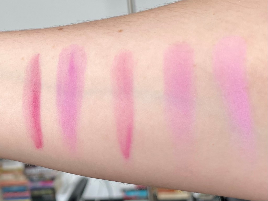 L-R: Haze, Score, Wisp, Night Bloom, Downy Lavender. Wisp is clearly the most muted of the three, as well as the sheerest.