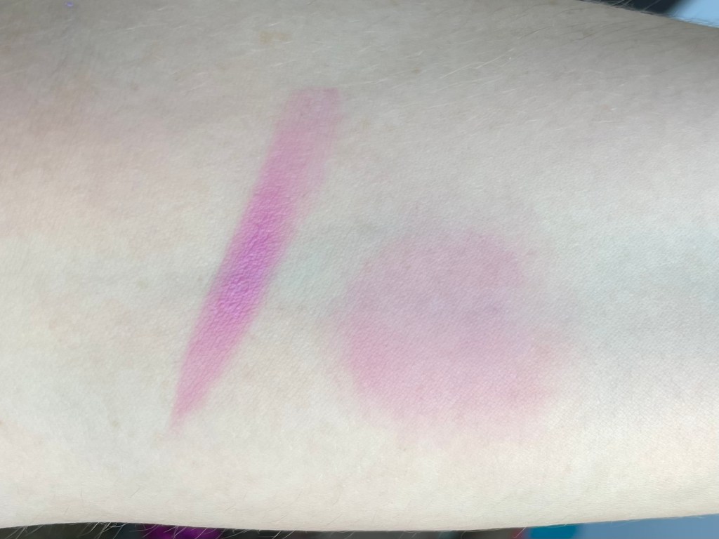 Glossier designed Wisp as “a soft lilac,” and they took the “soft” part seriously. Most purple blushes I’ve tried are on the bright magenta side, but Wisp is a muted heather shade that still manages to remain in the purple category. I might even call it a true mauve; it’s certainly closer to mauve than most makeup shades with “mauve” in their names. It’s also my least pigmented Cloud Paint; I find that I need two coats if I want it to make much impact on my face, and I’m pretty pale (probably a G12 in Glossier complexion products, though I’m a little darker now that it’s summer). Below, you can see one swipe swatched directly on my arm, then blended out, though the color payoff here is misleading—my inner arm is obviously paler and less textured than my face.