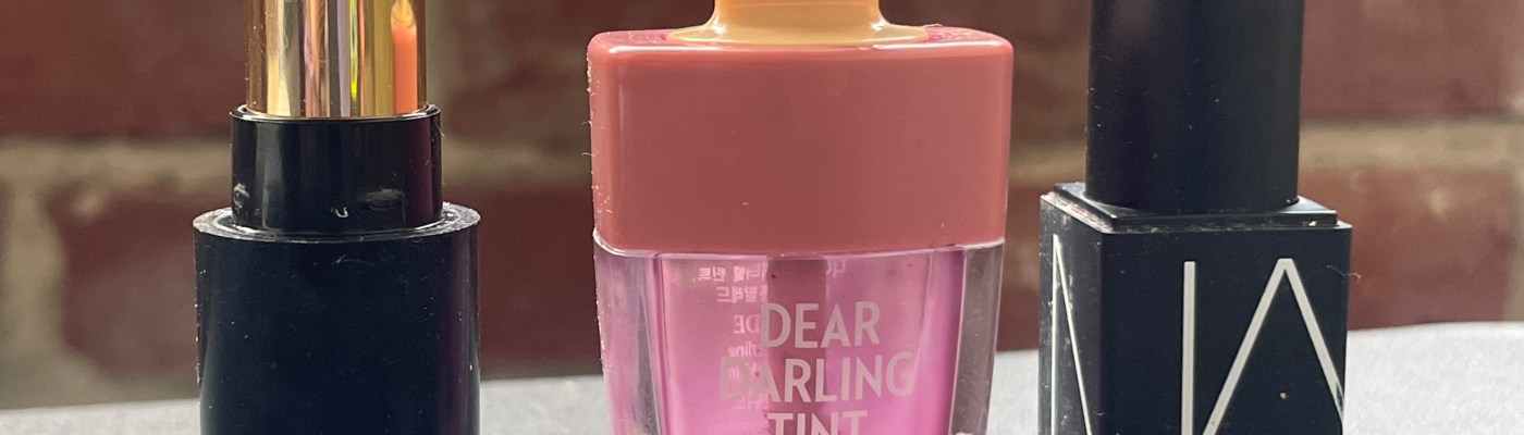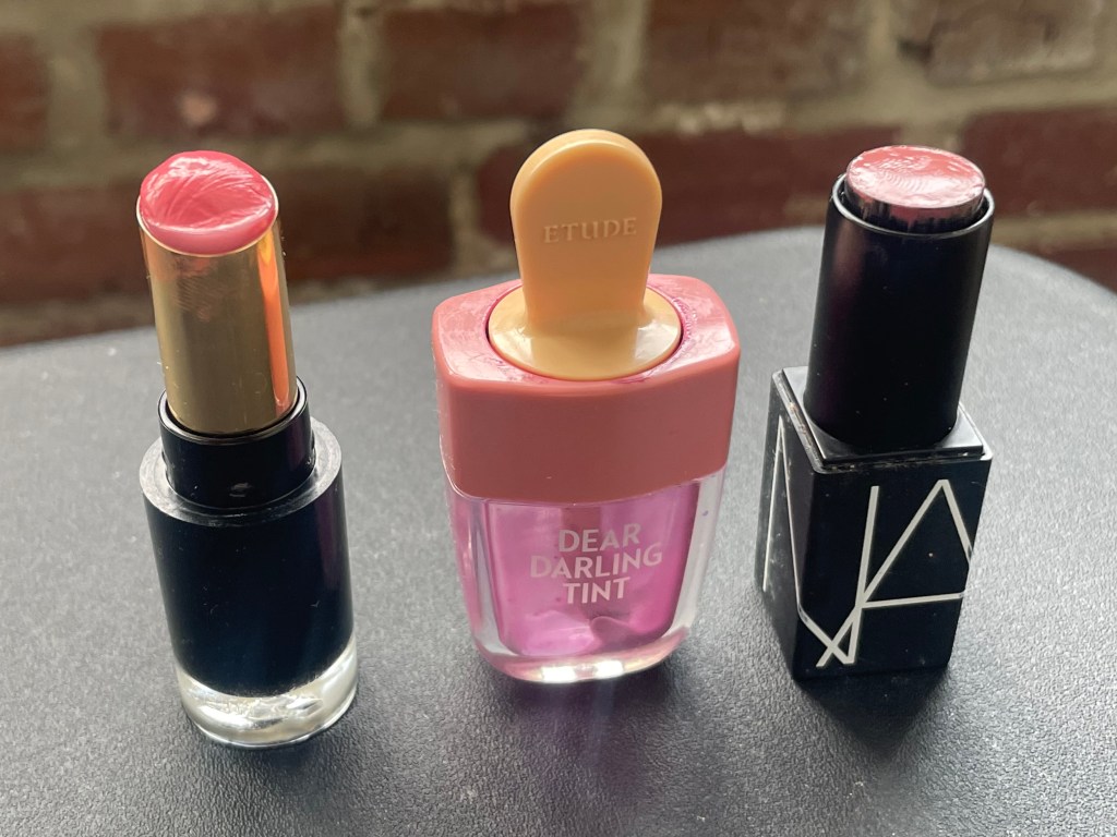 L-R: Revlon Glass Shine Lipstick in Beaming Strawberry, Etude House Dear Darling Tint in Red Bean Red, NARS Sheer Lipstick in Dolce Vita.