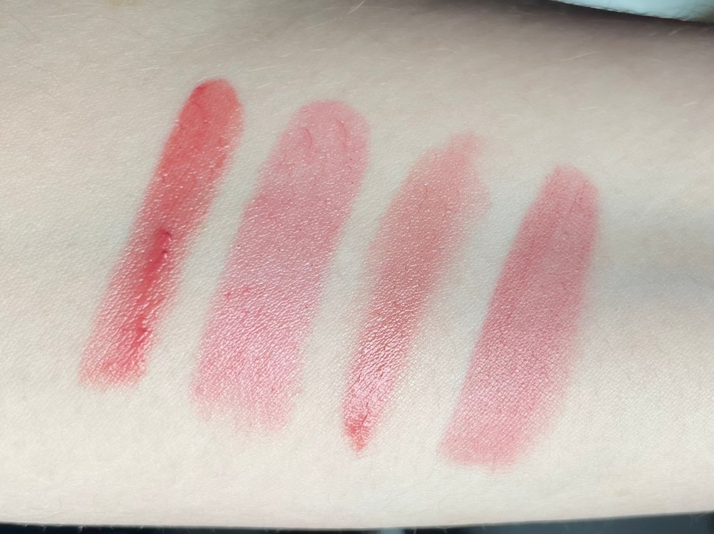 Now for the real question: how close is the new Glass Shine formula to the old one? Revlon promises “same formula, new look,” but the name change from “Glass Shine Lipstick” to “Glass Shine Balm” suggests that the formula is now sheerer. Here’s Glossed Up Rose swatched alongside the three original Glass Shines I still own, and you can see that Glossed Up Rose is just a touch less pigmented (and less shiny) than the others. L-R: Glossed Up Rose, Fire & Ice, Glaring Coral, and Beaming Strawberry (finger swatch), in direct (top) and indirect sunlight: