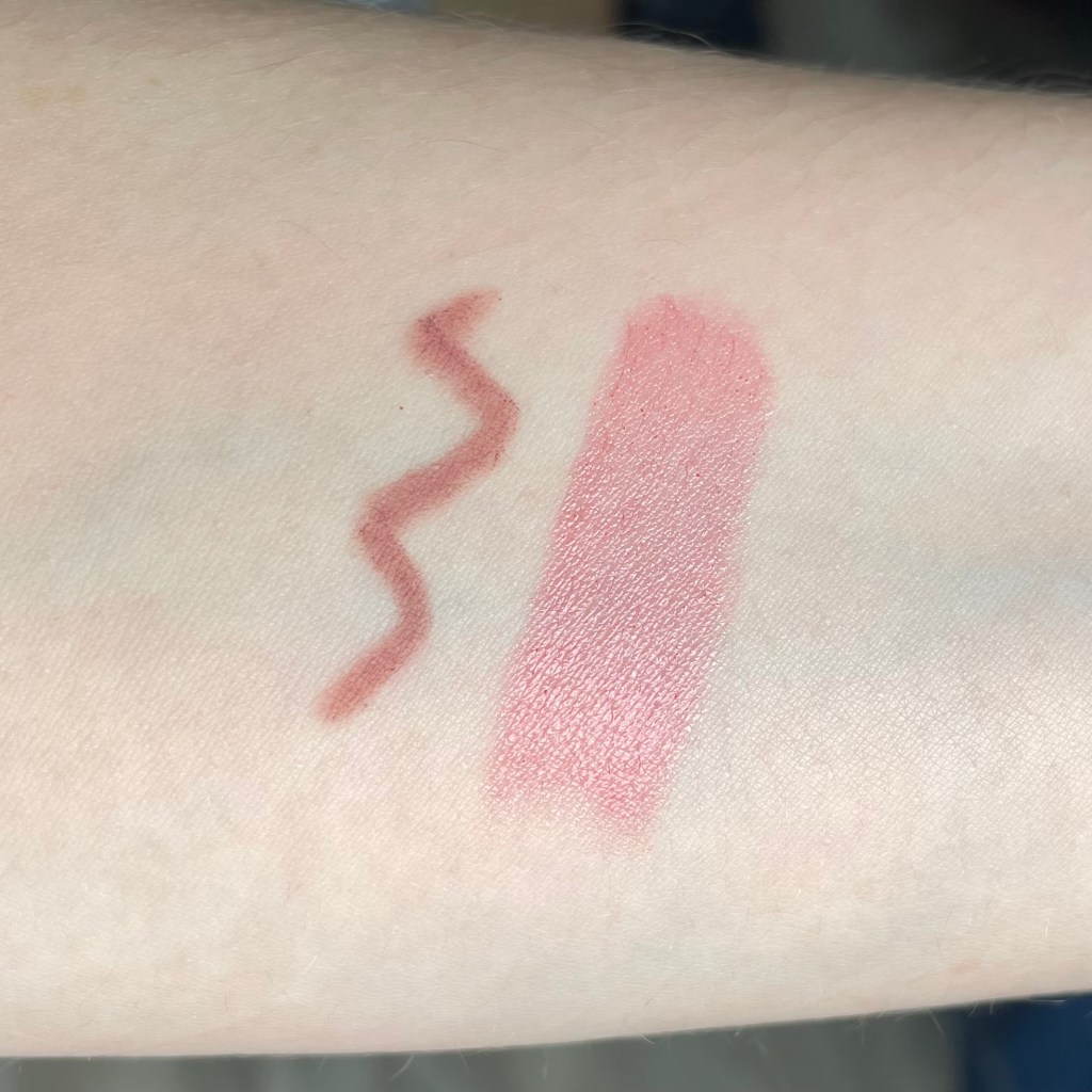 To make the lipstick last a little longer, I’ve been pairing it with a NYX Slim Lip Pencil so old that the shade name has completely rubbed off (I think it’s either Mauve or Neutral?):