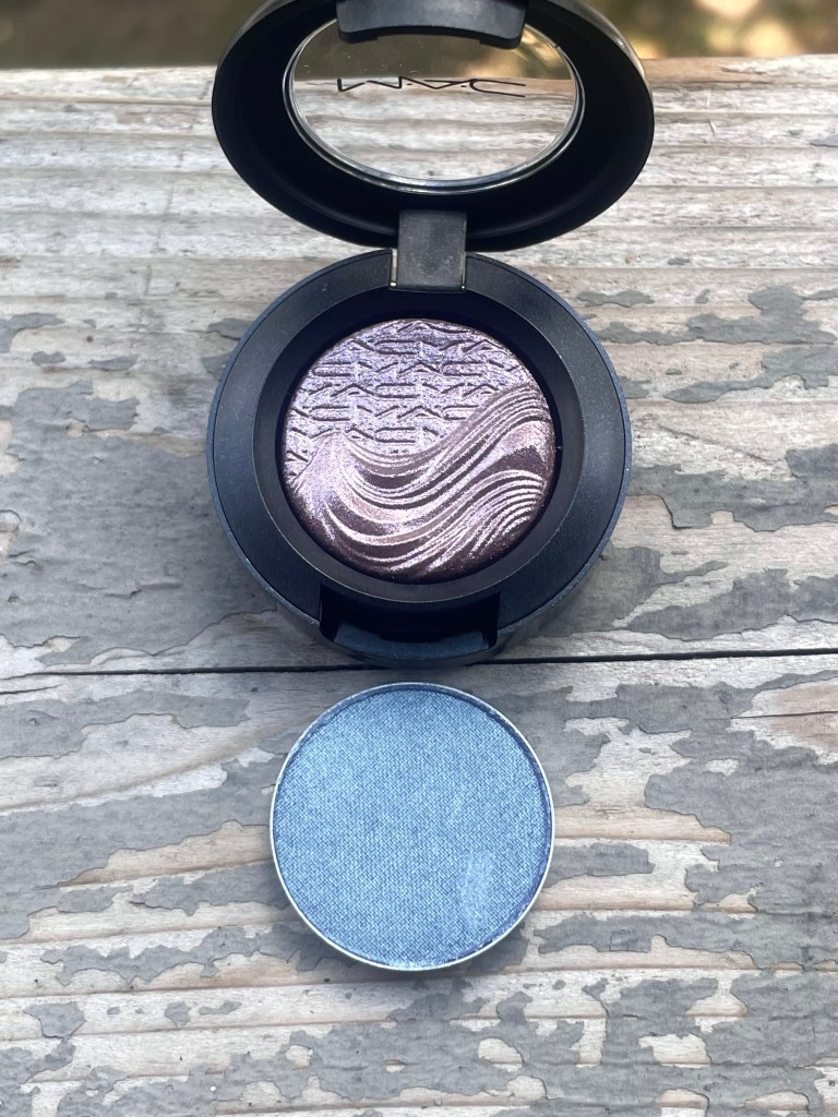 Then, during the Labor Day sale, I bought two powder eyeshadows: Tilt, a grayish blue in MAC’s regular formula, and Smoky Mauve, from the oft-praised (and, at $25, usually quite pricey) Extra Dimension line: