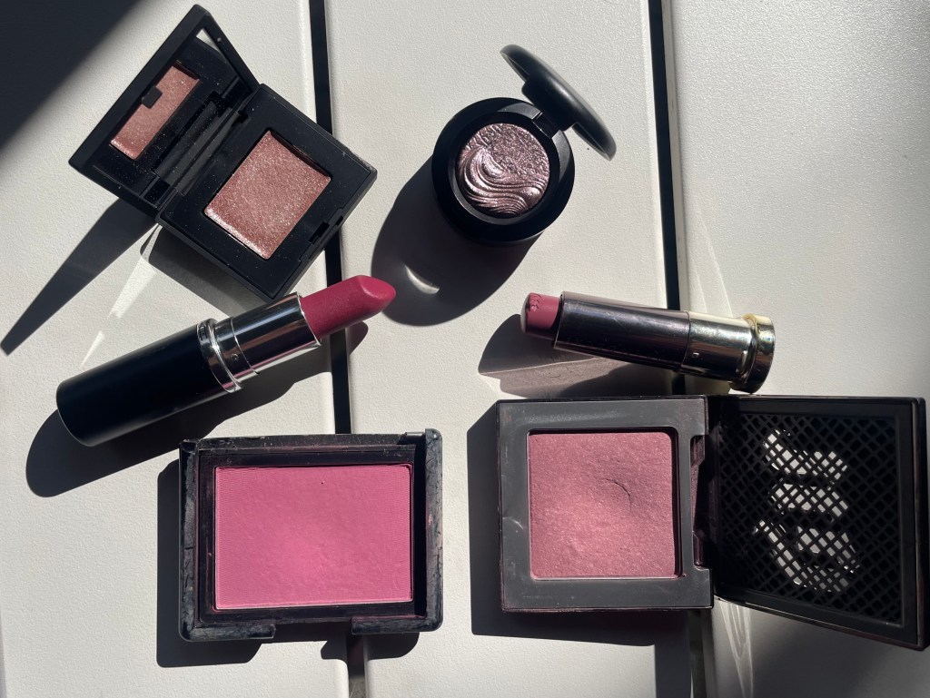 Since my earliest teaching days a decade ago, I’ve gravitated toward mauve and plum shades for the classroom. This fall, I’ve been enjoying two such looks: a rosy one with NARS Hardwired Eyeshadow in Earthshine, Mata Hari again, and MAC Captive Audience, and a more purple-toned one with MAC Smoky Mauve, Urban Decay Afterglow Blush in Rapture, and Urban Decay Vice Lipstick in Rapture. Three new or newish products and three extremely old ones!