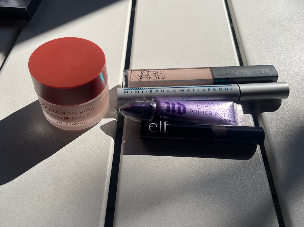 Without further preamble, here are four looks I’ve worn since the beginning of the semester! The constants in all of the looks are e.l.f. Wow Brow in Neutral Brown, Maybelline Lash Discovery waterproof mascara in Very Black, and NARS Radiant Creamy Concealer in Affogato. I still wear good old UD Primer Potion under my powder eyeshadows, and I like to prep my lips with a thin layer of Trader Joe’s cinnamon-roll lip mask, which I bought a few weeks ago. By the way, please ignore the patio-furniture background of my flatlays and the bus-stop and passenger-seat settings of my selfies; I still haven’t figured out the best lighting for photos in our new(ish) apartment.
