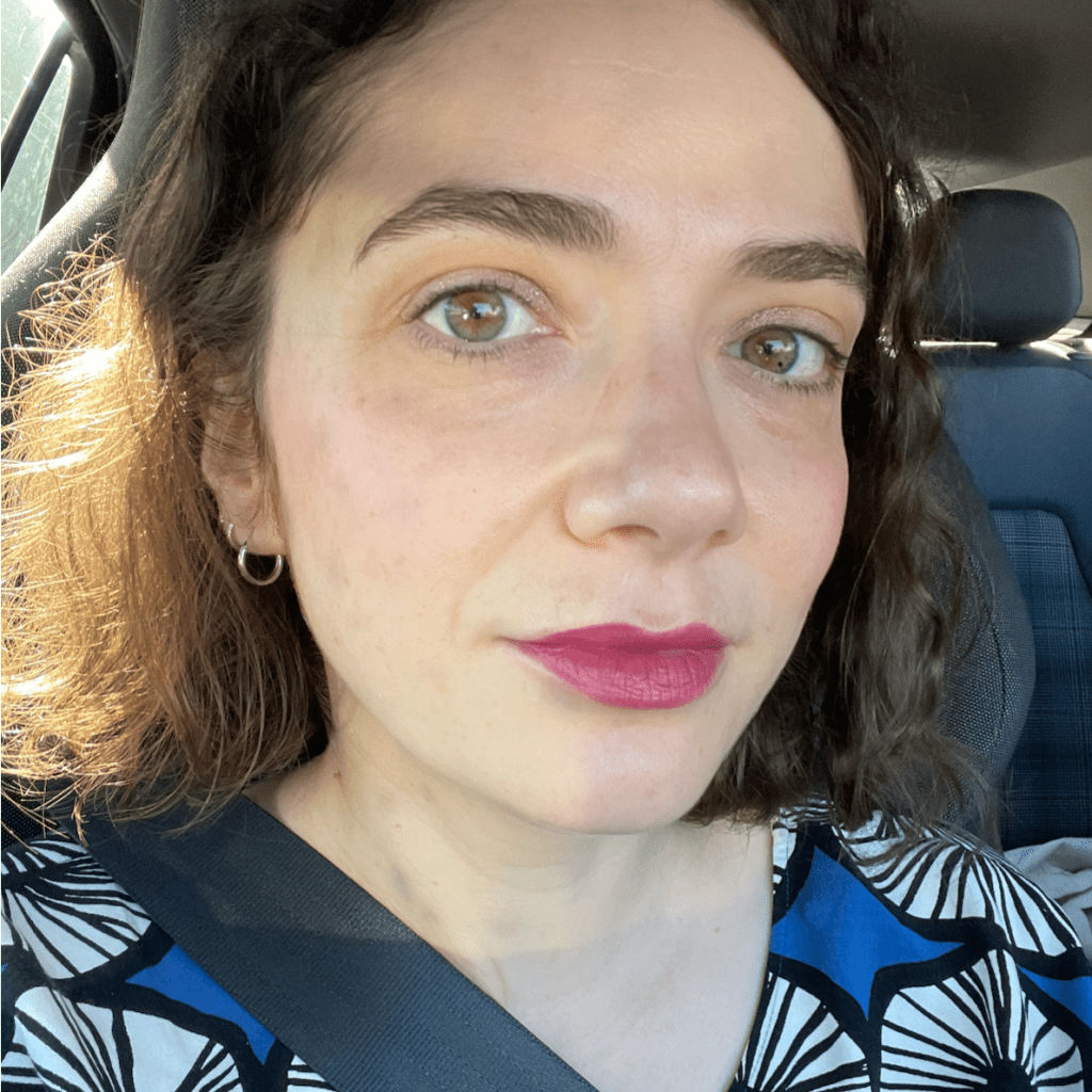 Congrats on the new teaching gig! When I was at community college back in 2002 there were many people in class wearing sweats or actual pajamas (and one fabulous goth girl wearing a kilo of jewelry and perfect winged liner) so I can’t imagine your students are terribly invested in your lipstick – rock those bold colors! P.S. Tilt is stunning on you.