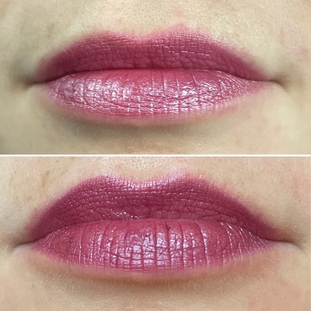 However, I’ve recently been loving Va Va Violet paired with Iced Amethyst! I apply Iced Amethyst all over my lips and outline with Va Va Violet for a subtle ombré look. It’s a great feeling when a new product can help me appreciate a neglected one. Here’s Iced Amethyst on its own (top) and mixed with Va Va Violet: