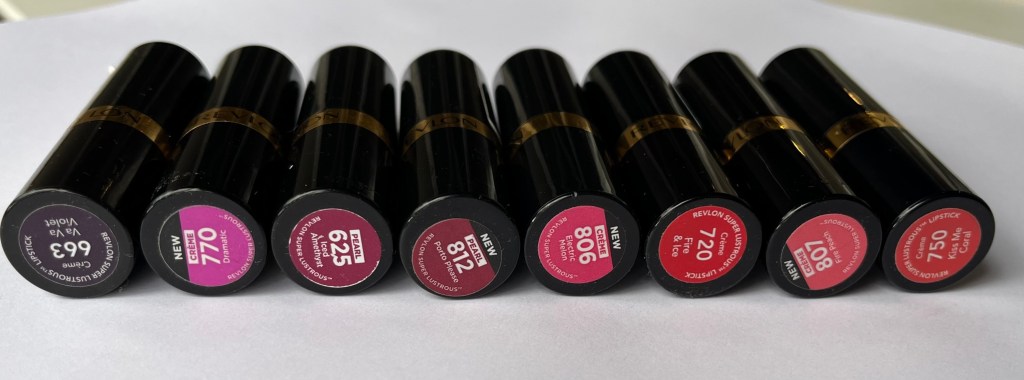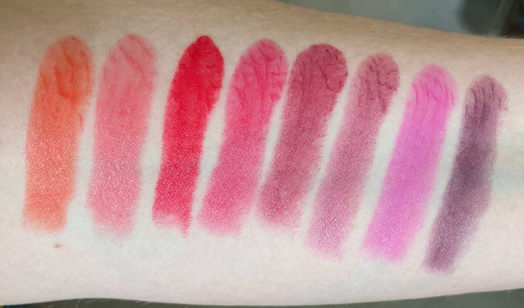 Currently, I own eight Super Lustrous shades. Three of them—Electric Melon, Fire Peach, and Porto Please—are from last year’s shade expansion; Dramatic was released shortly before I bought it in 2021; and the other four have been around for decades (seven decades, in Fire & Ice’s case). L-R: Va Va Violet, Dramatic, Iced Amethyst, Porto Please, Electric Melon, Fire & Ice, Fire Peach, Kiss Me Coral.