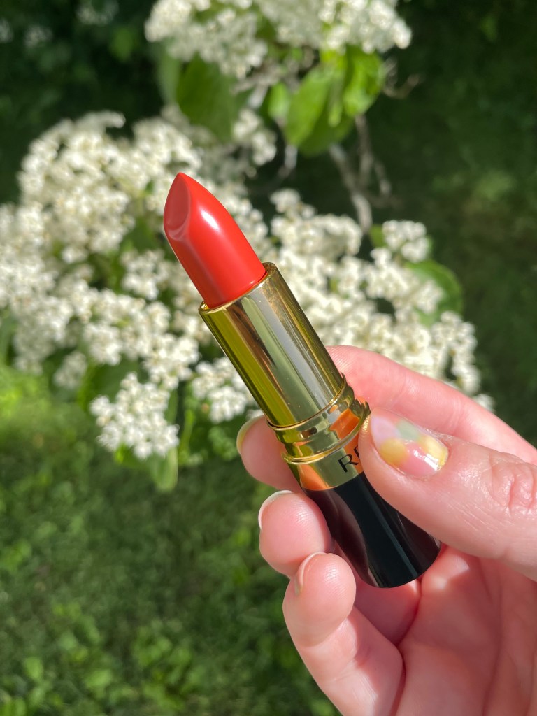 This was one of my favorite purchases of 2022, but I’ve gone off it a bit since then. Coral is a tricky color for me, and I generally do better with bright corals like Fire & Ice than I do with brownish corals like Kiss Me Coral. (It doesn’t look at all brown in the photo above, but it’s more muted and earthy on my lips.) I feel that it suits me in the summer when my complexion warms up, though, so I’m keeping it around. I can’t seem to find any recent photos of myself wearing it, but here’s one taken soon after I bought it: